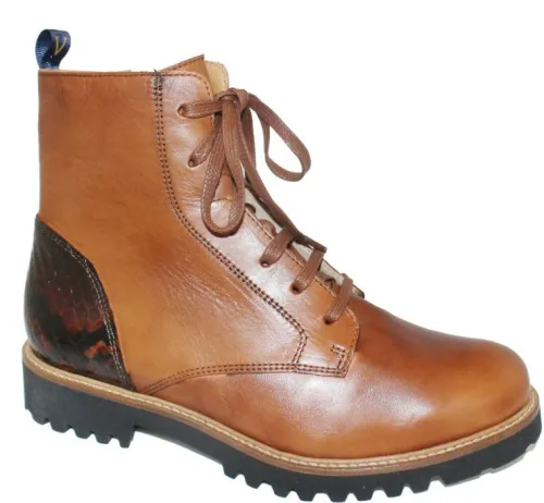 Boot van Verhulst in cognac leer met een croco inzet bij de hiel. Aan de binnenzijde zit een rits. Gemaakt op een extra brede K wijdte op de leest Kim. De boot heeft een glad voorblad en een slankere teenpartij. Het onderwerk is van licht gewicht poro rubber en de hak is bijna plat. De voetbedden zijn uitneembaar en ze zijn dus geschikt voor uw eigen steunzool. ||Verhulst is een Nederlands fabrikaat, met diverse leesten en wijdtematen. Het ontwerp en de afwerking geschied in Tilburg. De productie vindt in het buitenland plaats, onder toezicht van eigen mensen. Verhulst schoenen koopt u off en online bij Ruttenschoenen.nl