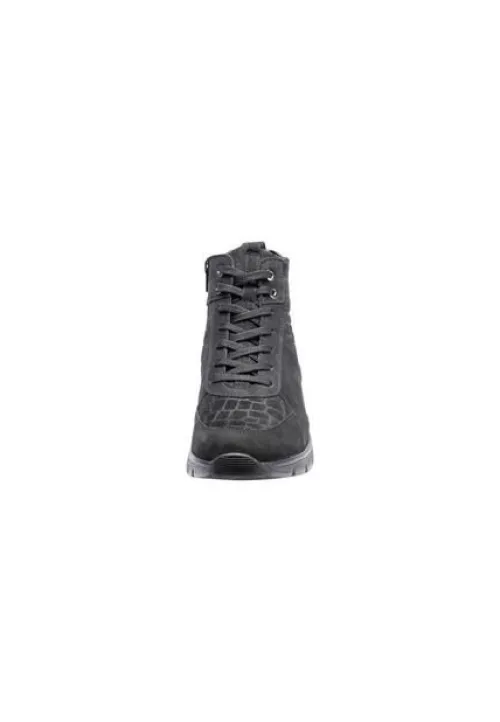 Boot van Waldlaufer op een extra brede K wijdte op de leest Ramona. Gemaakt in zwart nubuck in combinatie met een print en met lak. Aan de binnenzijde zit een rits waardoor die extra makkelijk is aan en uit te trekken. De voetbedden zijn uitneembaar en daardoor is de boot geschikt voor uw eigen steunzool. ||||Waldlaufer is een Duits merk. Kenmerkend is dat ze licht zijn van gewicht en zacht van leer. Er zijn verschillende wijdtematen en meestal zijn de voetbedden uitneembaar. Waldlaufer koopt u online bij Ruttenschoenen.nl