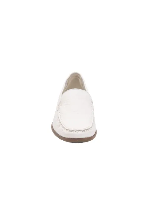 Mocasin van Waldlaufer gemaakt op een brede H wijdte in wit leer op de leest Harriet. De hak is bijna plat en de schoen is licht van gewicht. De voetbedden zijn uitneembaar en daardoor is de schoen te dragen met uw eigen steunzool. ||Waldlaufer is een Duits merk. Kenmerkend is dat ze licht zijn van gewicht en zacht van leer. Er zijn verschillende wijdtematen en meestal zijn de voetbedden uitneembaar.