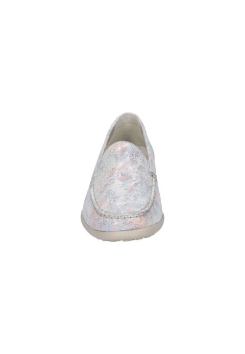 Mocasin van Waldlaufer gemaakt op een extra brede K wijdte in zilverwit nubuck met een fantasie print met allerlei pasteltinten op de leest Klare. Aan beide zijden zit elastiek waardoor een betere sluiting. De hak is bijna plat en de schoen is licht van gewicht. De voetbedden zijn uitneembaar en daardoor is de schoen geschikt voor uw eigen steunzool. ||Waldlaufer is een Duits merk. Kenmerkend is dat ze licht zijn van gewicht en zacht van leer. Er zijn verschillende wijdtematen en meestal zijn de voetbedden uitneembaar.