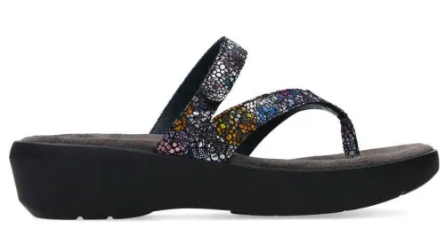Teenslipper van Wolky met 2 verstelbare klittebanden in een zwart met verschillende kleuren fantasie print. De slipper heeft een bijna platte hak. De sandaal is gemaakt op de leest Summer. De slipper heeft een goed vast voetbed wat niet uitneembaar is. ||Wolky is een Nederlands merk, wat grotendeels in Portugal geproduceerd wordt. Kenmerkend zijn de zachte zolen waarop u verend loopt. Het lopen op wolken effect. Wolky koopt u online bij Ruttenschoenen.nl