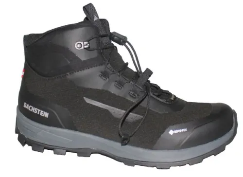 Wandel boots voor heren van Dachstein op een A Categorie met een stabiele zool, waar flink wat wandelingen op kunnen worden gemaakt. In een zwarte stof met kunstmateriaal en een rubberen neus. Door de Goretex is die wind en water dicht en de boot heeft een stevige profielzool. De voetbedden zijn uitneembaar. ||In 1925 werd de eerste schoen van het merk Dachstein geproduceerd. Het Oostenrijkse bedrijf combineert de traditionele wandelschoenen met moderne materialen, om zo vooruitstrevende wandelschoenen te maken. Deze wandelschoenen bieden u topkwaliteit en comfort voor een wandeling in de bergen. Dachstein schoenen zijn gemaakt voor iedereen die houdt en geniet van een outdoor lifestyle