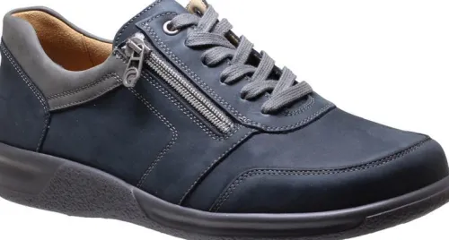 Sneaker van Ganter in blauw nubuck icm grijs nubuck. Aan de zijkant zit een rits waardoor die makkelijk is aan en uit te trekken. Gemaakt voor gevoelige extra brede voeten op een super brede K L wijdte op de leest Karl Ludwig. De schoen biedt extra ruite bij de tenen en is geschikt voor uw eigen steunzool. ||Ganter is een Duits fabrikaat, met diverse leesten en wijdtematen. Zij hebben natuur en milieu hoog in het vaandel. Ze maken tijdloze schoenen en gebruiken daarbij materialen die zo min mogelijk het milieu belasten. Zoals plantaardig gelooid leer, kurken voetbedden, tot aan papier uit duurzame bosbouw