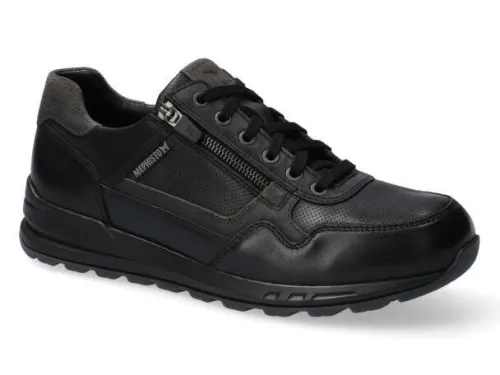 Sneaker van Mephisto in zwart leer met grijze details. Aan de buitenkant zit een rits waardoor als de veter eenmaal goed is ingesteld de schoen makkelijk is aan en uit te trekken. De schoen voelt lekker zacht aan. De zool heeft een profiel en is comfortabel met lopen. De schoen heeft een uitneembaar voetbed en is daardoor geschikt voor uw eigen steunzool. ||Mephisto is een Frans fabrikaat en heeft diverse fabrieken. Mephisto kenmerkt zich als een comfortabele schoen die meestal niet uitgelopen hoeft te worden, ook de zool is zacht en verend. Een echte schoen voor kilometers loopplezier. meestal niet uitgelopen hoeft te worden, ook de zool is zacht en verend. Een echte schoen voor kilometers loopplezier. Mephisto Koopt u offline en online bij Ruttenschoenen.nl