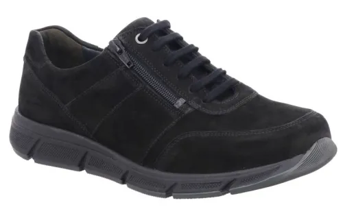 Heren veterschoen van Solidus in zwart suede. Geschikt voor superbrede gevoelige voeten op een M wijdte op de leest Kai. Aan de zijkant zit een rits, waardoor die makkelijk is aan en uit te trekken. De voetbedden zijn uitneembaar en de schoenen zijn dus geschikt voor uw eigen steunzool. ||Solidus is een Duits fabricaat, met diverse leesten en wijdtematen, tot super breed. Ze gebruiken zachte leersoorten, waardoor ze vaak zeer comfortabel en geschikt voor gevoelige voeten zijn. De schoenen zijn ook vaak lichter van gewicht. Veel leesten en artikelen komen vaak weer terug, veelal in een andere uitvoering. Solidus koopt u off en online bij Ruttenschoenen.nl