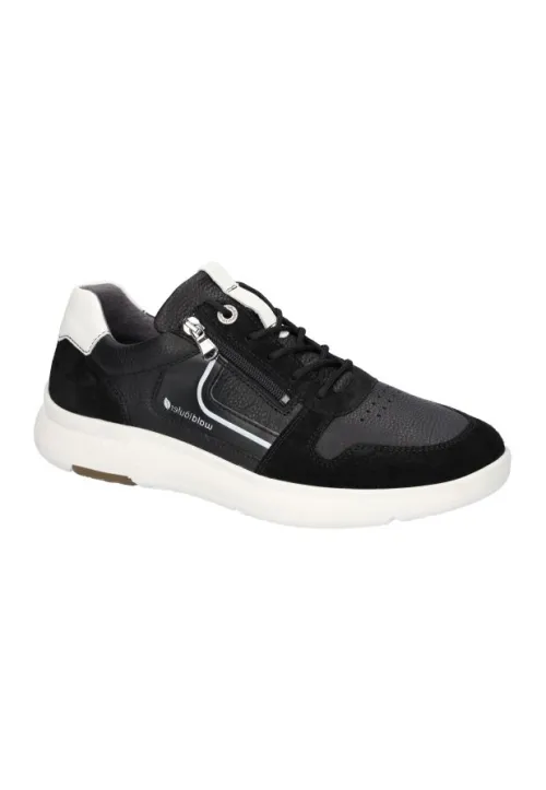 Sneaker van Waldlaufer geschikt voor een brede voet op een H wijdte op de leest Heiko in zwart met wit leer. De schoen heeft een rits aan de zijkant en een witte zool. De voetbedden zijn uitneembaar en daardoor is de schoen geschikt voor uw eigen steunzool. ||Waldlaufer is een Duits merk. Kenmerkend is dat ze licht zijn van gewicht en zacht van leer. Er zijn verschillende wijdtematen en meestal zijn de voetbedden uitneembaar. Waldlaufer koopt u online bij Ruttenschoenen.nl