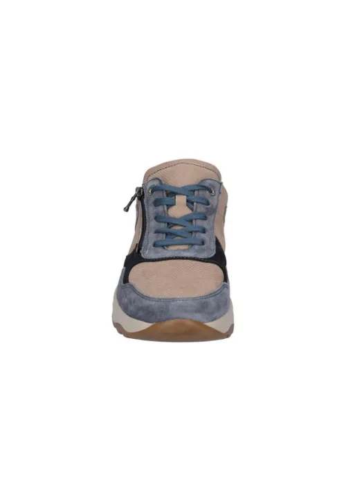 Sneaker van Waldlaufer geschikt voor een extra brede voet op een K wijdte op de leest K John in blauw met beige en jeans suede met nubuck. De schoen heeft een rits aan de zijkant en een licht gekleurde zool. De voetbedden zijn uitneembaar en daardoor is de schoen geschikt voor uw eigen steunzool. ||Waldlaufer is een Duits merk. Kenmerkend is dat ze licht zijn van gewicht en zacht van leer. Er zijn verschillende wijdtematen en meestal zijn de voetbedden uitneembaar. Waldlaufer koopt u online bij Ruttenschoenen.nl