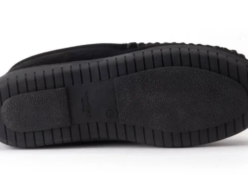 Pantoffel van Warmbat gevoerd met lamsvacht in zwart suede. Gemaakt op een mocassin maakwijze. De pantoffel is lekker zacht op de huid en heeft een comfortabele antislip, slijtvaste en schokdempende zool. ||||Warmbat komt uit Australie waar zij al meer dan 100 jaar wol van de merino schaap gebruiken. Er wordt 100% merino wol gebruikt wat het voordeel geeft van een goede kwaliteit en een goed ademend vermogen. De vezels kunnen tot 30% van het eigen gewicht aan vocht absorberen. ook is deze natuurlijke vacht temperatuur regulerend waardoor ze het hele jaar door zijn te dragen. Daarbij is het van natuur ook antibacterieel