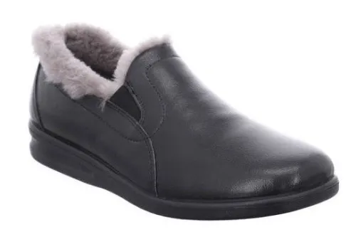 Heren pantoffel van Westland voorheen Romika in zwart leer met eem lamsvel voering en aan beide zijden elastiek, waardoor een betere sluiting en je er gemakkelijker in kan komen. ||Westland is een Duits pantoffelmerk welke in he verleden Romika pantoffels maakten. De naam Romika is verkocht maar de modellen en leesten zijn in eigen beheer gebleven. Dus tegenwoordig worden ze onder de naam Westland verkocht. . Sinds 2005 valt het onder de Josef Seibel groep die fabrieken hebben in de oostbloklanden als Hongarije, Roemenie en Tsjechie