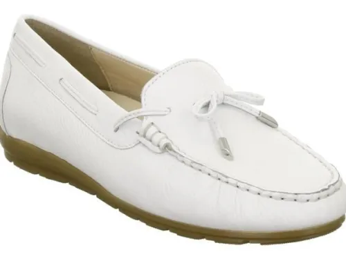 Mocassin met veter flosje van Ara in wit zacht leer op een G wijdte op de leest Alabama sport HS. Een mocassin is licht en soepel met dragen en sluit vaak mooi om de voeten. Door het highsoft voetbed is die heerlijk zacht om op te lopen. Het voetbed is uitneembaar dus mogelijk voor een eigen dunne steunzool. ||Ara is een Duits merk, die in vele landen zelf produceren. De schoenen zijn vaak zacht en licht van gewicht. Ze maken diverse wijdtes en leesten. De Duitse leest is vaak prima voor de Nederlandse voet. Sommige hebben een uitneembaar voetbed. Ara koopt u online bij Ruttenschoenen.nl