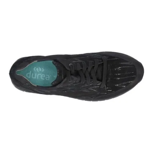 Veterschoen van Durea in zwart leer met nubuck en een fantasieprint. Deze schoen valt in de groep Citywalker van Durea, waarbij het lopen door de extra hoge teensprong vergemakkelijkt wordt. De schoen heeft een bijna platte hak van 17 mm en rond de enkel zit een polster. De schoen heeft een 2 componenten stijve TPU zool, waardoor zeer geschikt voor hielspoor, peesplaatontsteking en een stijve grote teen. Geschikt voor uw eigen steunzool op een brede H wijdte, op de leest 685 met een stevig contrefort. ||Durea is een Nederlands fabricaat, met diverse leesten en wijdtematen. Het ontwerp en de afwerking geschiedt in Drunen. De productie vindt in het buitenland plaats, waar Durea fabrieken bezit, onder toezicht van eigen mensen. Iedere schoen ondergaat ca 200 handelingen, Daar Durea alles in eigen beheer heeft kunnen zij hun hoge kwaliteit waarborgen. Durea koopt u online en offline bij Ruttenschoenen.nl
