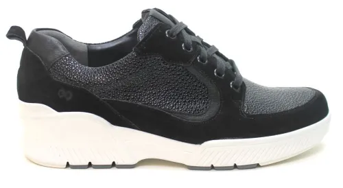 Sneaker van Durea op moderne nieuwe Go zool in zwart suède met leer gecombineerd met een fantasieprint en een lichtgekleurde zool. Kenmerken van de innovatieve Go zool is dat die lichter van gewicht is en zorgt voor een ideaal looppatroon welke de natuurlijke houding van het lichaam stimuleert. Aan de zijkant zit een rits zodat als de veter eenmaal is ingesteld de schoen makkelijk aan en uit te trekken is. Tevens zorgt de zool voor veel demping. Gemaakt op een brede H wijdte op de leest 685. De hak is 1,7 cm hoog. De schoen heeft een uitneembaar voetbed en is geschikt voor uw eigen steunzool. ||Durea is een Nederlands fabricaat, met diverse leesten en wijdtematen. Het ontwerp en de afwerking geschiedt in Drunen. De productie vindt in het buitenland plaats, waar Durea eigen fabrieken bezit, onder toezicht van eigen mensen. Iedere schoen ondergaat ca 200 handelingen, Daar Durea alles in eigen beheer heeft kunnen zij hun hoge kwaliteit waarborgen. Durea koopt u off en online bij Ruttenschoenen.nl
