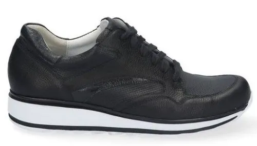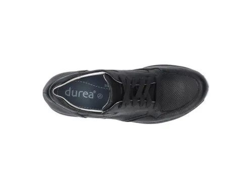 Durea sneaker op een extra smalle D wijdte op de leest 681 in zwart leer. Deze sneaker heeft een perforatieprint op de spiegel en aan de zijkant. De schoen heeft een bijna platte hak van 1.7 cm en rond de enkel zit een polster. De Sophie zool is licht van gewicht, stabiek, flexibel en extra dempend. Daarbij geeft het een extra afwikkeling wat het lopen vergemakkelijkt. ||Durea is een Nederlands fabricaat, met diverse leesten en wijdtematen. Alle leesten van Durea zijn zgn gebroken leesten, dat wil zeggen de hielpartij is altijd een smallere leest is dan de voorvoet. Het ontwerp en de afwerking geschiedt in Drunen. De productie vindt in het buitenland plaats, waar Durea fabrieken bezit, onder toezicht van eigen mensen. Iedere schoen ondergaat ca 200 handelingen, Daar Durea alles in eigen beheer heeft kunnen zij hun hoge kwaliteit waarborgen. Durea koopt u offline en online bij Ruttenschoenen.nl