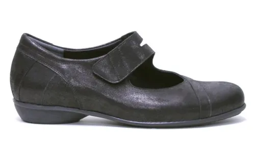 Bandschoen van Durea in zwart metallic leer op suède basis. De band is verstelbaar met klittenband, het voorblad heeft een V sluiting, waardoor minder kans op snijden bij de voorvoet. Geschikt voor uw eigen steunzool op een smalle E wijdte, op de leest 012 met een platte hak en stevig contrefort. Deze leest heeft een hakhoogte van 17 mm. ||Durea is een Nederlands fabricaat, met diverse leesten en wijdtematen. Het ontwerp en de afwerking geschiedt in Drunen. De productie vindt in het buitenland plaats, waar Durea eigen fabrieken bezit, onder toezicht van eigen mensen. Iedere schoen ondergaat ca 200 handelingen. Daar Durea alles in eigen beheer heeft kunnen zij hun hoge kwaliteit waarborgen. mensen. Iedere schoen ondergaat ca 200 handelingen. Daar Durea alles in eigen beheer heeft kunnen zij hun hoge kwaliteit waarborgen.
