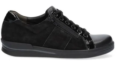 Sneaker van Durea in zwart leer met nubuck en een lakrand op een smalle E wijdte op de leest 682 met een stabiele PU zool. Aan de zijkant zit een rits, waardoor de schoen makkelijk is aan en uit te trekken. De schoen biedt veel stabiliteit en demping met lopen en is geschikt bij voeten die extra stevigheid nodig hebben. De zool is slijtvast en biedt een optimaal loopcomfort. De sleehak is 1,7 cm hoog. De schoen heeft een uitneembaar voetbed en is geschikt voor uw eigen steunzool. ||Durea is een Nederlands fabricaat, met diverse leesten en wijdtematen. Het ontwerp en de afwerking geschiedt in Drunen. De productie vindt in het buitenland plaats, waar Durea eigen fabrieken bezit, onder toezicht van eigen mensen. Iedere schoen ondergaat ca 200 handelingen, Daar Durea alles in eigen beheer heeft kunnen zij hun hoge kwaliteit waarborgen.