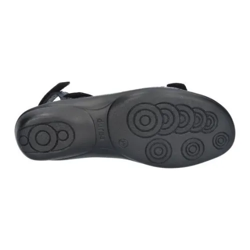 Sandaal van Durea in blauw suede met een fijne print met 3 klittenbanden. De banden zijn verstelbaar met klittenband. Geschikt voor uw eigen steunzool op een smalle E wijdte, op de leest 215 met een lage hak van 2 cm. De sandaal heeft een lichte en soepele PU zool met demping op de leest 215. ||Durea is een Nederlands fabricaat, met diverse leesten en wijdtematen. Het ontwerp en de afwerking geschiedt in Drunen. De productie vindt in het buitenland plaats, waar Durea eigen fabrieken bezit, onder toezicht van eigen mensen. Iedere schoen ondergaat ca 200 handelingen, Daar Durea alles in eigen beheer heeft kunnen zij hun hoge kwaliteit waarborgen.