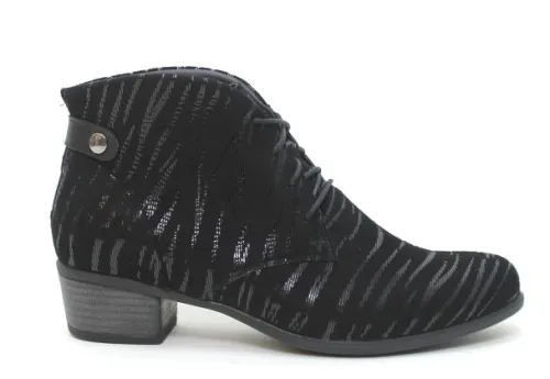 Boot van Durea in zwart nubuck met zilvergrijze fantasieprint op een smalle E wijdte op de leest 932. Deze boot heeft een lage hak van 3 cm en polstering onder de voorvoet. Uiteraard heeft de boot een stevig contrefort. De voetbedden zijn uitneembaar en de boot is daardoor ook geschikt voor uw eigen steunzool. ||Durea is een Nederlands fabricaat, met diverse leesten en wijdtematen. Het ontwerp en de afwerking geschiedt in Drunen. De productie vindt in het buitenland plaats, waar Durea fabrieken bezit, onder toezicht van eigen mensen. Iedere schoen ondergaat ca 200 handelingen, Daar Durea alles in eigen beheer heeft kunnen zij hun hoge kwaliteit waarborgen. Durea koopt u online bij Ruttenschoenen.nl