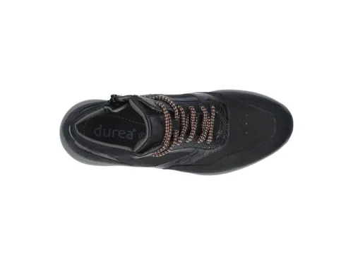 Boot van Durea met een rechte teenligging waardoor er meer ruimte in de breedte voor de tenen is. De boot is gemaakt in zwart nubuck en gevoerd met Drymex en is daardoor lichter van gewicht. Aan de binnenzijde zit een rits waardoor die makkelijk is aan en uit te trekken. Drymax kan ook goed vocht opnemen. Uitermate geschikt om er een stukje op te wandelen. Gemaakt op een smalle E wijdte op de leest 602. De voetbedden zijn uitneembaar. ||Durea is een Nederlands fabricaat, met diverse leesten en wijdtematen. Het ontwerp en de afwerking geschiedt in Drunen. De productie vindt in het buitenland plaats, waar Durea eigen fabrieken bezit, onder toezicht van eigen mensen. Iedere schoen ondergaat ca 200 handelingen, Daar Durea alles in eigen beheer heeft kunnen zij hun hoge kwaliteit waarborgen.