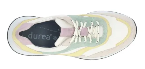 Durea sneaker in verschillende kleuren suede met gladleer gecombineerd. Gemaakt op een smalle wijdte E leest 682. De schoen heeft een moderne stabiele zool, die licht van gewicht is, flexibel, antislip en extra demping geeft. De schoen is gemaakt op een gebroken wijdte dwz dat de schoen in de hielpartij smaller is, waardoor die extra goed om de hiel sluit. Het uitneembare voetbed maakt dat die geschikt is voor uw eigen steunzool. ||Durea is een Nederlands fabricaat, met diverse leesten en wijdtematen. Het ontwerp en de afwerking geschiedt in Drunen. De productie vindt in het buitenland plaats, waar Durea eigen fabrieken bezit, onder toezicht van eigen mensen. Iedere schoen ondergaat ca 200 handelingen, Daar Durea alles in eigen beheer heeft kunnen zij hun hoge kwaliteit waarborgen.