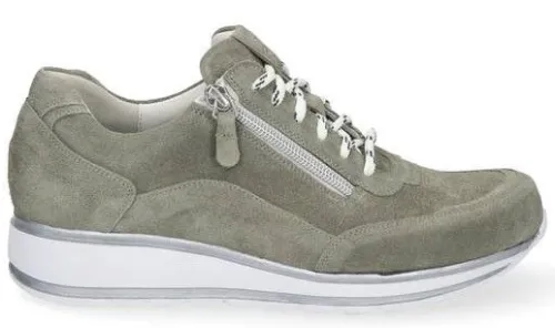 Sneaker van Durea in groen suede op een G wijdte op de leest 684. Aan de zijkant zit een rits waardoor die makkelijk is aan en uit te trekken. Geschikt voor een smalle tot gemiddelde voet met een uitneembaar voetbed waarvoor u uw eigen steunzool kan vervangen. De schoen is stabiel en slijtvast en biedt veel demping bij de voorvoet. De schoen is gemaakt op een gebroken wijdte dwz dat de schoen in de hielpartij smaller is, waardoor die extra goed om de hiel sluit. De zool is van Eva gemaakt en de hak is 1,7 cm hoog. De zool heeft een extra afwikkeling. ||Durea is een Nederlands fabricaat, met diverse leesten en wijdtematen. Het ontwerp en de afwerking geschiedt in Drunen. De productie vindt in het buitenland plaats, waar Durea eigen fabrieken bezit, onder toezicht van eigen mensen. Iedere schoen ondergaat ca 200 handelingen, Daar Durea alles in eigen beheer heeft kunnen zij hun hoge kwaliteit waarborgen. Durea koopt u offline en online bij Ruttenschoenen.nl