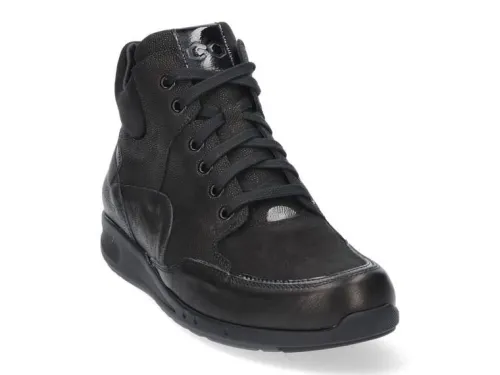 Boot van Durea op de Go leest in zwart leer met nubuck op een bijna platte sleehak. Aan de zijkant zit een rits waardoor die makkelijk is aan en uit te trekken. De innovatie van de Go zool zorgt voor een ideaal looppatroon en stimuleert daarmee een natuurlijke houding van het lichaam waarbij het lopen vergemakkelijkt wordt. De boots zijn lichter van gewicht, soepel met dragen en zorgen voor veel demping en stabiliteit. Uitermate geschikt bij een hallux valgus, hallux rigidus, hielspoor, peesplaatontsteking en reuma. Goed te verstellen met een veter, daarbij is de boot gemaakt op een gebroken wijdte dwz dat de boot in de hielpartij smaller is, waardoor die extra goed om de hiel sluit. De zool is van PU en de hak is 1,7 cm hoog. Gemaakt op een G wijdte op de leest 684. Uiteraard heeft de boot een stevig contrefort en een uitneembaar voetbed. ||Durea is een Nederlands fabricaat, met diverse leesten en wijdtematen. Het ontwerp en de afwerking geschiedt in Drunen. De productie vindt in het buitenland plaats, waar Durea fabrieken bezit, onder toezicht van eigen mensen. Iedere schoen ondergaat ca 200 handelingen, Daar Durea alles in eigen beheer heeft kunnen zij hun hoge kwaliteit waarborgen. Durea koopt u online bij Ruttenschoenen.nl