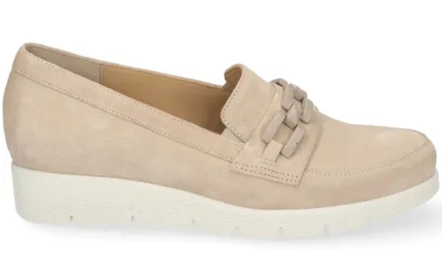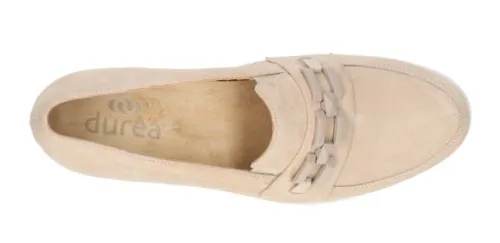 Loafer van Durea in licht beige suede met een sierband over de wreef en elastiek aan de zijkant. Gemaakt op een brede H wijdte op de leest 095. De schoen heeft een moderne stabiele doorlopende zool, die licht van gewicht is, flexibel, antislip en extra demping geeft. De schoen is gemaakt op een gebroken wijdte dwz dat de schoen in de hielpartij smaller is, waardoor die extra goed om de hiel sluit. Het uitneembare voetbed maakt dat die geschikt is voor uw eigen steunzool. ||Durea is een Nederlands fabricaat, met diverse leesten en wijdtematen. Het ontwerp en de afwerking geschiedt in Drunen. De productie vindt in het buitenland plaats, waar Durea eigen fabrieken bezit, onder toezicht van eigen mensen. Iedere schoen ondergaat ca 200 handelingen, Daar Durea alles in eigen beheer heeft kunnen zij hun hoge kwaliteit waarborgen.