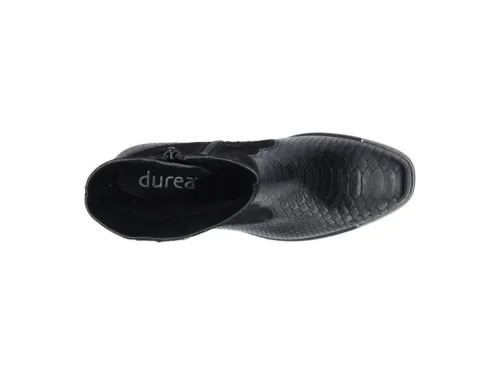 Westernlaars van Durea in zwart leer met een print in combinatie met nubuck met een rits aan de binnenzijde. Gemaakt op een brede H wijdte op de leest 995 met de TPU zool Veerle. Bij de hak en de voorzijde een zilverkleurige bit. Dit laarsje heeft een hakhoogte van 33 mm en is geschikt voor uw eigen steunzool. Uiteraard heeft de laars een stevig contrefort. ||Durea is een Nederlands fabricaat, met diverse leesten en wijdtematen. Het ontwerp en de afwerking geschiedt in Drunen. De productie vindt in het buitenland plaats, waar Durea fabrieken bezit, onder toezicht van eigen mensen. Iedere schoen ondergaat ca 200 handelingen, Daar Durea alles in eigen beheer heeft kunnen zij hun hoge kwaliteit waarborgen.
