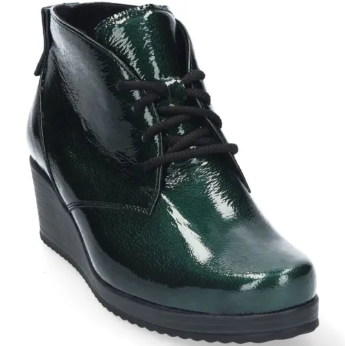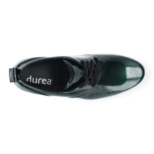 Boot van Durea in donker groen lakleer op een brede H wijdte op de leest 585. Deze boot is wat gekleder en heeft een sleehak met een plateau zool waardoor de hak hoger lijkt dan dat deze is. Uiteraard heeft de boot een stevig contrefort. De voetbedden zijn uitneembaar en de boot is daardoor ook geschikt voor uw eigen steunzool. Durea is een Nederlands fabricaat, met diverse leesten en wijdtematen. Het ontwerp en de afwerking geschiedt in Drunen. De productie vindt in het buitenland plaats, waar Durea fabrieken bezit, onder toezicht van eigen mensen. Iedere schoen ondergaat ca 200 handelingen, Daar Durea alles in eigen beheer heeft kunnen zij hun hoge kwaliteit waarborgen. Durea koopt u online bij Ruttenschoenen.nl