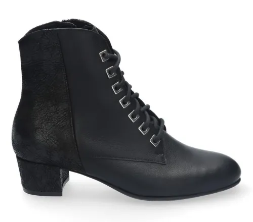Geklede boot van Durea in zwart met aan de achterzijde geprint nubuck. Gemaakt op een brede H wijdte op leest 915, het onderwerk is Mayke met een lage hak van 30 mm. De boot heeft een stevig contrefort is stabiel, licht van gewicht, flexibel, extra dempend en anti slip. De zool is van rubber en de voetbedden zijn uitneembaar. ||Durea is een Nederlands fabricaat, met diverse leesten en wijdtematen. Het ontwerp en de afwerking geschiedt in Drunen. De productie vindt in het buitenland plaats, waar Durea fabrieken bezit, onder toezicht van eigen mensen. Iedere schoen ondergaat ca 200 handelingen, Daar Durea alles in eigen beheer heeft kunnen zij hun hoge kwaliteit waarborgen.