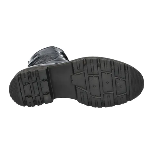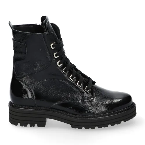 Bikerboot van Durea in zwart kreuklak met zilveren vetergaten op een H wijdte op de leest 755 met de zool Sam. Deze leest biedt extra ruimte bij de tenen. De boot heeft een lage blokhak van 16 mm met een zool van EVA. Daardoor is die licht van gewicht, flexibel en extra dempend en daarnaast ook stabiel. De voetbedden zijn uitneembaar dus ook geschikt voor eigen steunzool. ||Durea is een Nederlands fabricaat, met diverse leesten en wijdtematen. Het ontwerp en de afwerking geschiedt in Drunen. De productie vindt in het buitenland plaats, waar Durea fabrieken bezit, onder toezicht van eigen mensen. Iedere schoen ondergaat ca 200 handelingen, Daar Durea alles in eigen beheer heeft kunnen zij hun hoge kwaliteit waarborgen. Durea koopt u online bij Ruttenschoenen.nl