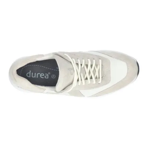 Lichtgewicht sneaker van Durea met een rechte teenligging waardoor er meer ruimte in de breedte voor de tenen is. De schoen is gemaakt offwhite suede met leer en een Drymex voering. Mede daardoor is die lichter van gewicht en luchtiger met dragen. Drymax kan ook goed vocht opnemen. Uitermate geschikt om er een stukje op te wandelen. Gemaakt op een extra brede K wijdte op de leest 608 met de zool Fleur. Deze is licht van gewicht, stabiel, dempend, antislip en flexibel. De voetbedden zijn uitneembaar. ||Durea is een Nederlands fabricaat, met diverse leesten en wijdtematen. Het ontwerp en de afwerking geschiedt in Drunen. De productie vindt in het buitenland plaats, waar Durea eigen fabrieken bezit, onder toezicht van eigen mensen. Iedere schoen ondergaat ca 200 handelingen, Daar Durea alles in eigen beheer heeft kunnen zij hun hoge kwaliteit waarborgen.