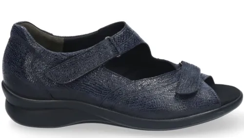 Sandaal van Durea met een dichte hiel in blauw nubuck met een fijne streepjes print. De sandaal is verstelbaar met 2 klittenbanden op de voet. Mede door de dichte hiel biedt deze sandaal extra stevigheid. Gemaakt op een extra brede K wijdte op de leest 238. De voetbedden zijn uitneembaar en daardoor ook geschikt voor uw eigen steunzool. De sleehak is 2 cm en de zool is gemaakt van Pu met demping. ||Durea is een Nederlands fabricaat, met diverse leesten en wijdtematen. Het ontwerp en de afwerking geschiedt in Drunen. De productie vindt in het buitenland plaats, waar Durea eigen fabrieken bezit, onder toezicht van eigen mensen. Iedere schoen ondergaat ca 200 handelingen, Daar Durea alles in eigen beheer heeft kunnen zij hun hoge kwaliteit waarborgen.