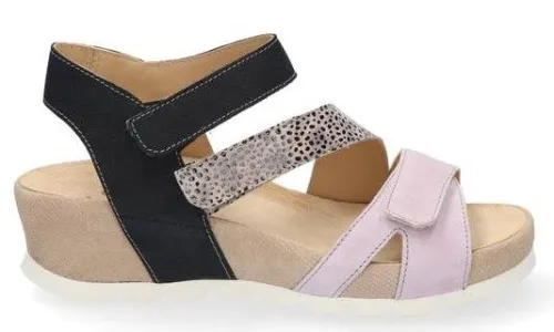 Sandaal van Durea met 3 klittenbanden in zwart met roze suede en een leopard print. De banden zijn verstelbaar met klittenband. De hak lijkt hoger lijkt dan die is door de plateauzool. De zool is antislip en heeft extra demping met een hakhoogte van 2 cm. Geschikt voor uw eigen steunzool op een extra brede K wijdte, op de leest 028. Daar de zijkanten open zijn zul je sneller de steunzool zien liggen. Een tip is om er een kousenvoetje omheen te doen of de steunzolen speciaal in de sandaal te laten maken. ||Durea is een Nederlands fabricaat, met diverse leesten en wijdtematen. Het ontwerp en de afwerking geschiedt in Drunen. De productie vindt in het buitenland plaats, waar Durea eigen fabrieken bezit, onder toezicht van eigen mensen. Iedere schoen ondergaat ca 200 handelingen, Daar Durea alles in eigen beheer heeft kunnen zij hun hoge kwaliteit waarborgen. Durea koopt u online bij Ruttenschoenen.nl