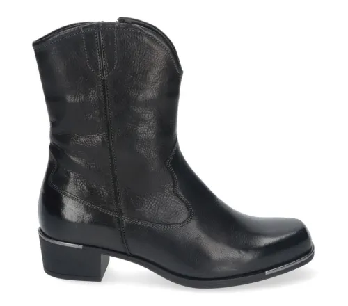 Westernlaars van Durea in zwart leer en een rits aan de binnenzijde. Gemaakt op een extra brede K wijdte op de leest 998 met de TPU zool Veerle. Bij de hak en de voorzijde een zilverkleurige bit. Dit laarsje heeft een hakhoogte van 33 mm en is geschikt voor uw eigen steunzool. Uiteraard heeft de laars een stevig contrefort. ||Durea is een Nederlands fabricaat, met diverse leesten en wijdtematen. Het ontwerp en de afwerking geschiedt in Drunen. De productie vindt in het buitenland plaats, waar Durea fabrieken bezit, onder toezicht van eigen mensen. Iedere schoen ondergaat ca 200 handelingen, Daar Durea alles in eigen beheer heeft kunnen zij hun hoge kwaliteit waarborgen.