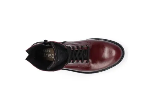 Bikerboot van Durea in donker rood leer met op de tong een fijne print op een extra brede K wijdte op de leest 188 met de zool Candy. De boot heeft een lage blokhak van 15 mm met een zool van EVA. Daardoor is die licht van gewicht, flexibel en extra dempend en daarnaast ook stabiel en antislip. De voetbedden zijn uitneembaar dus ook geschikt voor eigen steunzool. ||Durea is een Nederlands fabricaat, met diverse leesten en wijdtematen. Het ontwerp en de afwerking geschiedt in Drunen. De productie vindt in het buitenland plaats, waar Durea fabrieken bezit, onder toezicht van eigen mensen. Iedere schoen ondergaat ca 200 handelingen, Daar Durea alles in eigen beheer heeft kunnen zij hun hoge kwaliteit waarborgen. Durea koopt u online bij Ruttenschoenen.nl