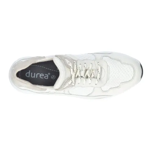 Lichtgewicht sneaker van Durea met een rechte teenligging waardoor er meer ruimte in de breedte voor de tenen is. De schoen is gemaakt van wit geprint leer met wit nubuck met een Drymex voering. Daardoor is die lichter van gewicht en luchtiger met dragen. Drymax kan ook goed vocht opnemen. Uitermate geschikt om er een stukje op te wandelen. Gemaakt op een extra brede M wijdte op de leest 609. De voetbedden zijn uitneembaar. ||Durea is een Nederlands fabricaat, met diverse leesten en wijdtematen. Het ontwerp en de afwerking geschiedt in Drunen. De productie vindt in het buitenland plaats, waar Durea eigen fabrieken bezit, onder toezicht van eigen mensen. Iedere schoen ondergaat ca 200 handelingen, Daar Durea alles in eigen beheer heeft kunnen zij hun hoge kwaliteit waarborgen.