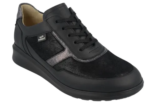 Een sneaker van FinnComfort op ongeveer een K wijdte. In het zwart leer met nubuck met stretch inzet op de neus. De zool heeft een lage sleehak en wikkelt goed af. De voetbedden zijn uitneembaar en dus geschikt voor u eigen podologische zolen. Aan de binnenzijde zit een rits waardoor de schoen makkelijk aan en uit te trekken is.