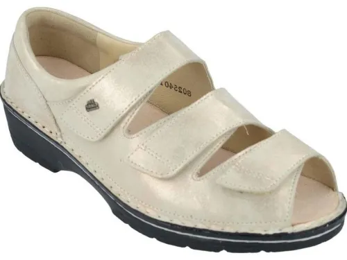 Dames sandaal van FinnComfort met een dichte hiel in room kleurig leer met een kalfsleren voering. Op een brede leest ca een H wijdte, waarbij de kurken voetbedden uitneembaar zijn en de sandaal met klittenband te verstellen is. De sandaal heeft een stevige hak van ca 25 mm. De zool is er met de hand aangenaaid. Deze sandaal valt erg klein uit. ||FinnComfort is een Duits merk , wat nog steeds in Duitsland wordt gemaakt en vaak ook deels nog handwerk is, dat merk je en dat voel je. De optimale pasvorm verzekert een schokabsorberende en natuurlijke afwikkeling van de voet. De schoen biedt veel ruimte bij de tenen, zoals het eigenlijk hoort. Veel schoenen hebben 2 verwisselbare voetbedden, waaronder een voetreflex massagevoetbed en een normaal kurken ondersteunend voetbed. Er zijn verschillende types en leesten, waar FinnComfort geen wijdte aan verbindt, welke wij proberen aan te geven met welke wijdte dit overeenkomt.