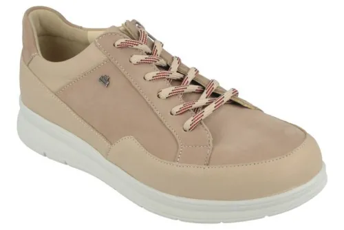 Dames veterschoen van FinnComfort in een zand combinatie leer met nubuck. Op een super brede leest ca een M wijdte, waarbij de voetbedden uitneembaar zijn en de schoen bij de tenen extra veel ruimte biedt. Aan de binnenzijde zit een rits wat extra makkelijk is vast te maken. De schoen heeft een bijna platte hak van ca 15 mm. ||FinnComfort is een Duits merk , wat nog steeds in Duitsland wordt gemaakt en vaak ook deels nog handwerk is, dat merk je en dat voel je. De optimale pasvorm verzekert een schokabsorberende en natuurlijke afwikkeling van de voet. De schoen biedt veel ruimte bij de tenen, zoals het eigenlijk hoort. Er zijn verschillende types en leesten, waar FinnComfort geen wijdte aan verbindt, welke wij proberen aan te geven met welke wijdte dit overeenkomt. Finn Comfort koop je online bij Ruttenschoenen.nl normaal kurken ondersteunend voetbed. Er zijn verschillende types en leesten, waar FinnComfort geen wijdte aan verbindt, welke wij proberen aan te geven met welke wijdte dit overeenkomt.