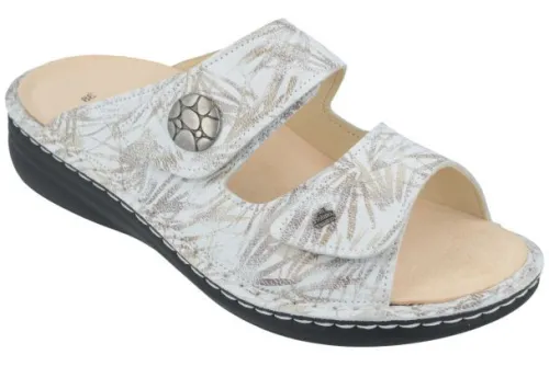 Dames slipper van Finn Comfort in beige kleur met donkere vegen. Op een brede leest ca een K wijdte, waarbij de zachte kurken voetbedden uitneembaar zijn en de slipper met klittenband te verstellen is. De slipper heeft een stevige hak van 25 mm. De zool is er met de hand aangenaaid. ||FinnComfort is een Duits merk , wat nog steeds in Duitsland wordt gemaakt en vaak ook deels nog handwerk is, dat merk je en dat voel je. De optimale pasvorm verzekert een schokabsorberende en natuurlijke afwikkeling van de voet. De schoen biedt veel ruimte bij de tenen, zoals het eigenlijk hoort. Veel schoenen hebben 2 verwisselbare voetbedden, waaronder een voetreflex massagevoetbed en een normaal kurken ondersteunend voetbed. Er zijn verschillende types en leesten, waar FinnComfort geen wijdte aan verbindt, welke wij proberen aan te geven met welke wijdte dit overeenkomt.