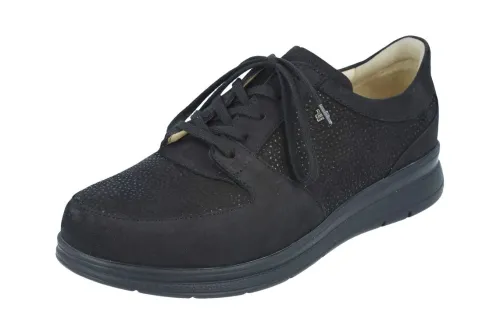 Dames veterschoen van FinnComfort in zwart nubuck met een fijne sier prent. Op een super brede leest ca een M wijdte, waarbij de voetbedden uitneembaar zijn en de schoen bij de tenen extra veel ruimte biedt. Met een bijna platte hak van ca 15 mm. ||FinnComfort is een Duits merk , wat nog steeds in Duitsland wordt gemaakt en vaak ook deels nog handwerk is, dat merk je en dat voel je. De optimale pasvorm verzekert een schokabsorberende en natuurlijke afwikkeling van de voet. De schoen biedt veel ruimte bij de tenen, zoals het eigenlijk hoort. Veel schoenen hebben 2 verwisselbare voetbedden, waaronder een voetreflex massagevoetbed en een normaal kurken ondersteunend voetbed. Er zijn verschillende types en leesten, waar FinnComfort geen wijdte aan verbindt, welke wij proberen aan te geven met welke wijdte dit overeenkomt. Finn Comfort koop je online bij Ruttenschoenen.nl normaal kurken ondersteunend voetbed. Er zijn verschillende types en leesten, waar FinnComfort geen wijdte aan verbindt, welke wij proberen aan te geven met welke wijdte dit overeenkomt.