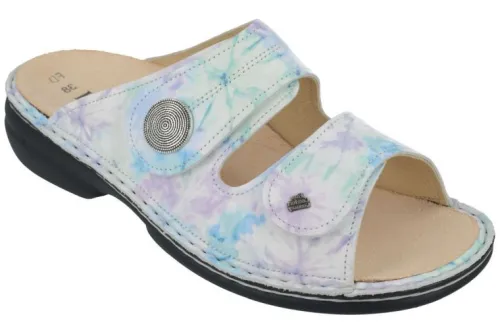 Dames slipper van Finn Comfort in een combinatie van pasteltinten waaronder licht blauw met een kalfsleren voering. Op een brede leest ca een K wijdte, waarbij de dikke kurken voetbedden uitneembaar zijn en de slipper met klittenband te verstellen is. De slipper heeft een stevige hak van ca 25 mm. De zool is er met de hand aangenaaid. ||FinnComfort is een Duits merk , wat nog steeds in Duitsland wordt gemaakt en vaak ook deels nog handwerk is, dat merk je en dat voel je. De optimale pasvorm verzekert een schokabsorberende en natuurlijke afwikkeling van de voet. De schoen biedt veel ruimte bij de tenen, zoals het eigenlijk hoort. Er zijn verschillende types en leesten, waar FinnComfort geen wijdte aan verbindt, welke wij proberen aan te geven met welke wijdte dit overeenkomt.