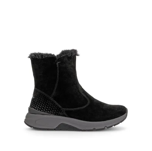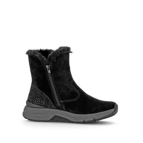 Korte laars van Gabor in zwart suede met een bontrandje met een Rolling soft zool. Deze leest heeft een speciale zool waarbij het lopen vergemakkelijkt wordt. Aan de binnenzijde zit een rits, waardoor die makkelijk aan en uit te tekken is. Het voetbed is uitneembaar, dus geschikt voor uw eigen steunzool. De laar heeft een bijna platte hak. ||Gabor is een Duits fabricaat, met diverse leesten en wijdtematen. Ze staan bekend om hun goede leesten en zachte leersoorten. Modisch comfortabel tegen betaalbare prijzen. Sommige hebben een uitneembaar voetbed. Gabor koop je online bij Ruttenschoenen.