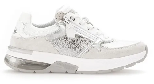 Sneaker van Gabor in een wit met zilver combinatie leer met suede. Gemaakt op een wijdte G met een Rolling soft zool. Deze leest heeft een speciale zool waarbij het lopen vergemakkelijkt wordt. Aan de zijkant zit een rits waardoor die makkelijker is aan en uit te trekken. Het voetbed is uitneembaar, dus geschikt voor uw eigen steunzool. De sneaker heeft een hakhoogte van ca 20 mm. ||Gabor is een Duits fabricaat, met diverse leesten en wijdtematen. Ze staan bekend om hun goede leesten en zachte leersoorten. Modisch comfortabel tegen betaalbare prijzen. Sommige hebben een uitneembaar voetbed. Gabor koop je online bij Ruttenschoenen.