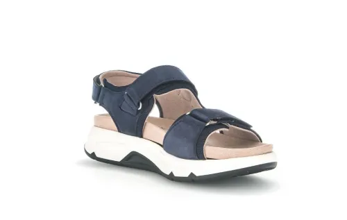 Lichtgewicht sandaal van Gabor op een G wijdte in blauw nubuck. Gemaakt op de Rolling Soft zool. Deze zool helpt bij de afwikkeling waardoor het lopen wordt vergemakkelijkt. De banden over de voet zijn met klittenband te verstellen. Met een bijna platte hak van 15 mm. ||Gabor is een Duits fabricaat, met diverse leesten en wijdtematen. Ze staan bekend om hun goede leesten en zachte leersoorten. Modisch comfortabel tegen betaalbare prijzen. Sommige hebben een uitneembaar voetbed. Gabor koopt u online bij Ruttenschoenen.n