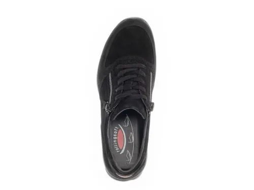 Sneaker van Gabor in zwart DriTan nubuck op een wijdte G op de leest GFP met een Rolling soft onderwerk. Deze leest heeft een speciale zool waarbij het lopen vergemakkelijkt wordt. Aan de 2 zijden zit een rits, waardoor die makkelijk is aan en uit te tekken. Met de DriTan techniek wordt er bij het vervaardigen minder water gebruikt, wat weer beter voor het milieu is. Het voetbed is uitneembaar, dus geschikt voor uw eigen steunzool. De sneaker heeft een hakhoogte van 20 mm. ||Gabor is een Duits fabricaat, met diverse leesten en wijdtematen. Ze staan bekend om hun goede leesten en zachte leersoorten. Modisch comfortabel tegen betaalbare prijzen. Sommige hebben een uitneembaar voetbed. Gabor koop je online bij Ruttenschoenen.