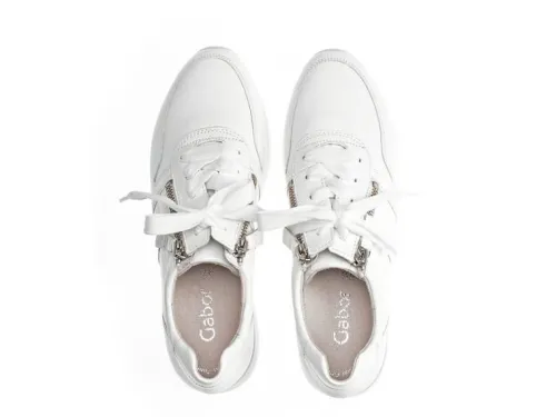 Sneaker van Gabor in wit leer op een wijdte F op de leest Kapsel. De sneaker heeft een wat gekledere uitstraling. De sneaker heeft 2 ritsen waardoor die makkelijk is aan en uit te trekken. De hak is bijna plat en het voetbed is uitneembaar. ||Gabor is een Duits fabricaat, met diverse leesten en wijdtematen. Ze staan bekend om hun goede leesten en zachte leersoorten. Modisch comfortabel tegen betaalbare prijzen. Sommige hebben een uitneembaar voetbed.