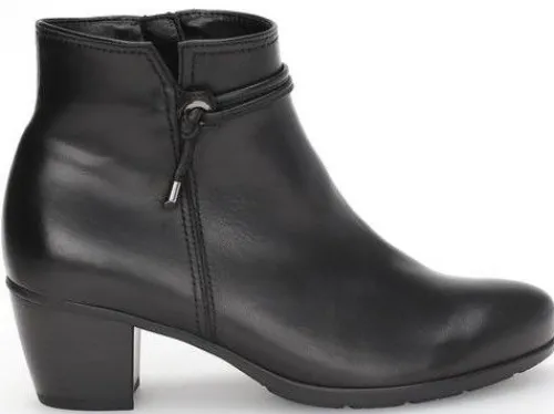 Korte laars van Gabor in zwart leer op de leest best fitting. Dit is een gebroken wijdte waarbij de voorvoet breder is dan de hielpartij. ca een F wijdte. De zool is een hoovercraft zool, waardoor die zacht is en buigzaam. Aan de binnenzijde zit een rits en aan de buitenzijde een spie met over de wreef een sierveter. De laars heeft een stevige blokhak en een uitneembaar voetbed. ||Gabor is een Duits fabricaat, met diverse leesten en wijdtematen. Ze staan bekend om hun goede leesten en zachte leersoorten. Modisch comfortabel tegen betaalbare prijzen. Sommige hebben een uitneembaar voetbed.