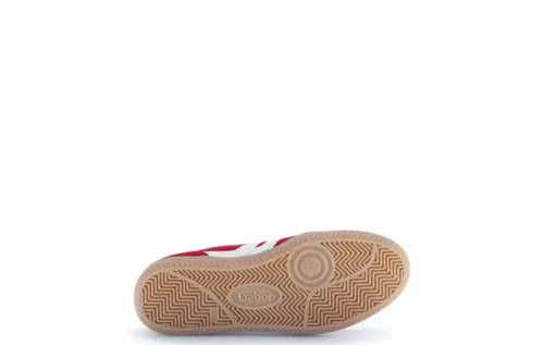 Sneaker van Gabor op een G wijdte in rood suede met wit leer. Bij de zijkant zitten 2 witte strepen mede door zool uiterlijk roept het model nostalgie op. Maar is helemaal van deze tijd. Met een bijna platte doorlopende zool van ca 20 mm. Deze schoen heeft een uitneembaar voetbed en is dus geschikt voor een steunzool. ||Gabor is een Duits fabricaat, met diverse leesten en wijdtematen. Ze staan bekend om hun goede leesten en zachte leersoorten. Modisch comfortabel tegen betaalbare prijzen. Sommige hebben een uitneembaar voetbed. Gabor koopt u online bij Ruttenschoenen.nl