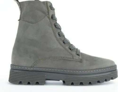 Biker boot van Gabor in groen nubuck op een wijdte G op de leest York. Aan de binnenzijde zit een rits waardoor die makkelijk is aan en uit te trekken. De boot heeft een stevige profielzool. Het voetbed is uitneembaar. ||Gabor is een Duits fabricaat, met diverse leesten en wijdtematen. Ze staan bekend om hun goede leesten en zachte leersoorten. Modisch comfortabel tegen betaalbare prijzen. Sommige hebben een uitneembaar voetbed.